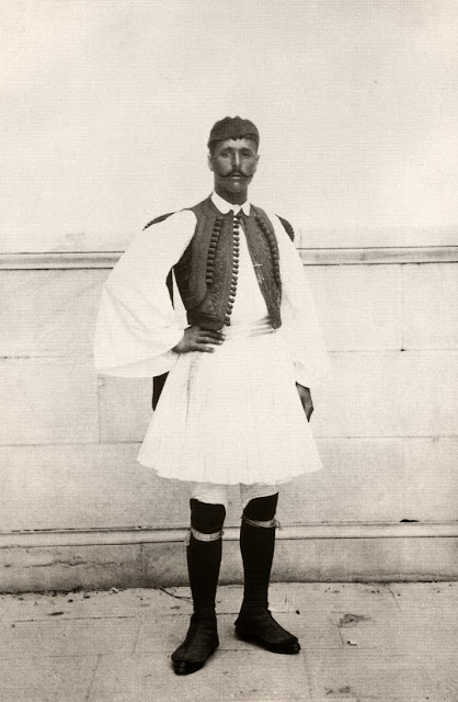 Spyros Louis, o primeiro vencedor da corrida Maratona, em uma roupa tradicional durante os primeiros Jogos Olímpicos. Grécia 1896..